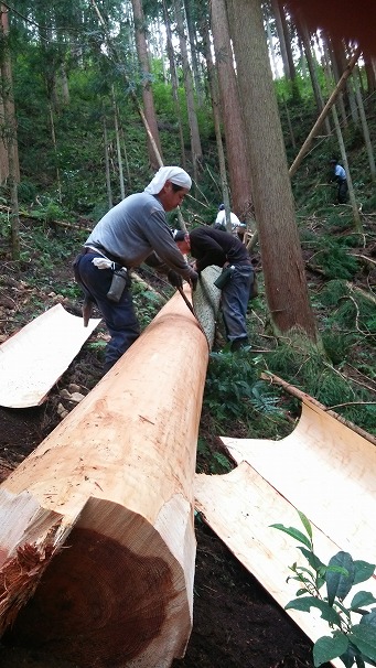 東吉野村、曽爾村にて伐採し、杉皮むきを行い、葉枯らし作業を行います。