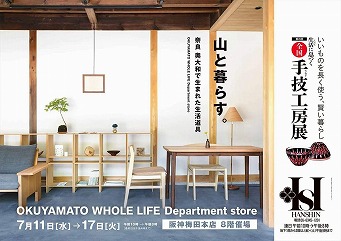 7月11日〜17日、阪神百貨店梅田本店の8階催事場でのイベントに弊社も出展しました。奈良県東部南部に移住してきた木工職人のテーブルや椅子、吉野桧や吉野杉を使った照明,生活道具など、日常のライフスタイルの中で展示されていました。今年は椅子が良く売れていました。日頃はこうした一般ユーザーに対面して販売することがなかなかないのでいい経験となりました。新しいアイテムを増やすことも考えています。ご来場誠にありがとうございました!