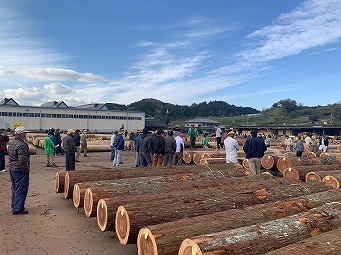 11月30日 奈良県銘木協同組合にて「全国優良材展示大会」が開催され、久しぶりに土場いっぱいの優良材が集まりました。弊社も伊賀市にて葉枯らしを行った90年生杉を中心に大量に出荷いたしました。市況は先行き不透明な中ですが精いっぱいの市売でした。